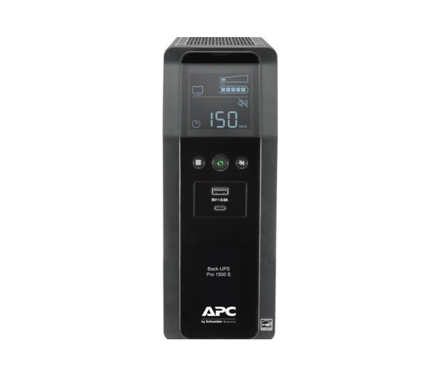 The APC Back-UPS Pro BX1350M is a line-interactive uninterruptible power supply (UPS) that provides reliable battery backup and surge protection for home and small business electronics. It has a compact tower design and features an LCD screen for monitoring system status.