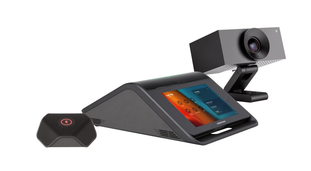 The Crestron Flex UC-MX70-T KIT provides a complete tabletop video conferencing solution for large rooms using native Microsoft Teams Rooms software. This kit includes a high-definition AI collaboration camera and an extension microphone pod for expanded audio.