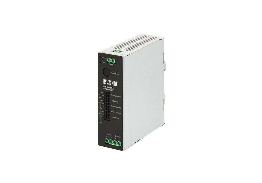The DIN24480DC is an Eaton 480W 24V DC DIN Rail Industrial Uninterruptible Power Supply (UPS) system. It provides reliable power and battery backup for industrial control, networking, and storage equipment in demanding environments