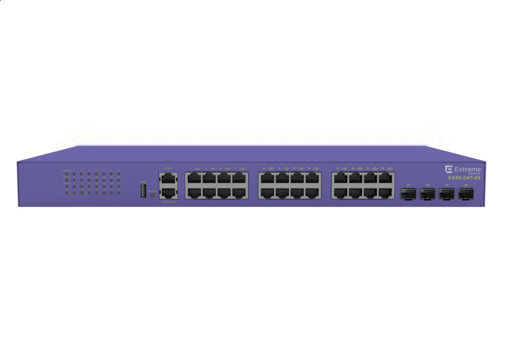 The Extreme Networks ExtremeSwitching X435-24P-4S is a managed Layer 2/3 Gigabit Ethernet switch designed as a cost-effective, high-density edge solution for branch and small sites. It offers 24 PoE+ ports and 4 SFP uplink ports, providing power and connectivity for various edge devices like IP phones and wireless access points.