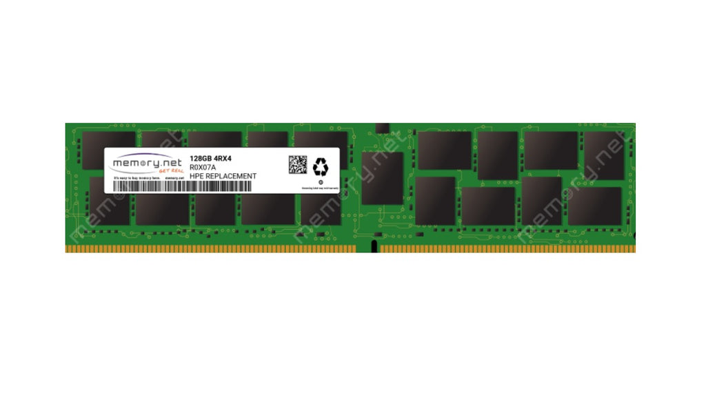 The R0X07A is the part number for the HPE 128GB (1x128GB) Quad Rank x4 DDR4-2933 CAS-21-21-21 Registered Smart Memory Kit. It is high-density server memory designed primarily for HPE ProLiant and HPE Superdome Flex systems.