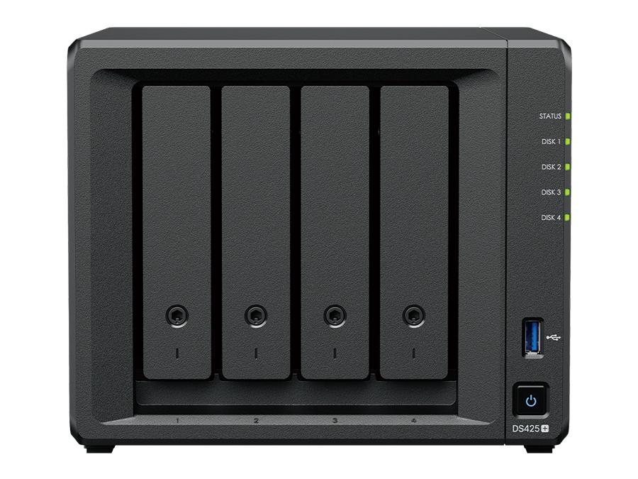 Synology DiskStation DS425+ delivers versatile 4-bay NAS performance with an Intel Celeron J4125 quad-core 2.0 GHz processor, 2GB DDR4 RAM (upgradable to 6GB), built-in 2.5GbE networking, and support for both 2.5"/3.5" SATA drives plus M.2 NVMe slots for cache acceleration, providing a powerful, scalable solution for streamlined workflows, site-to-site syncing, and secure data management.