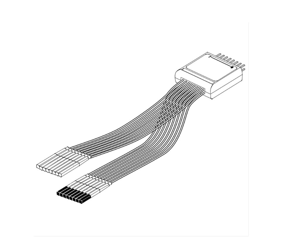 The model 196-3470-01 is an 8-channel leadset designed for single-ended connections. It is compatible with individual connections to backplanes and dense, single-ended configurations within a pin array measuring either 2 mm (0.079 inches) or 2.54 mm (0.1 inches). This leadset features two shared ground connections for all incoming signals. Additionally, each positive lead is equipped with a 150 ohm damping resistor.