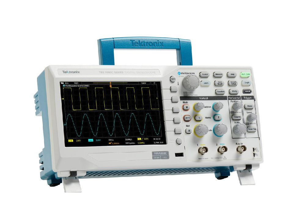 The product code TBS1202C identifies a Tektronix TBS1000C Series Digital Storage Oscilloscope (DSO) with 2 analog channels and a 200 MHz bandwidth. It is designed as an entry-level, general-purpose instrument for educational institutions, embedded design engineers, and hobbyists.