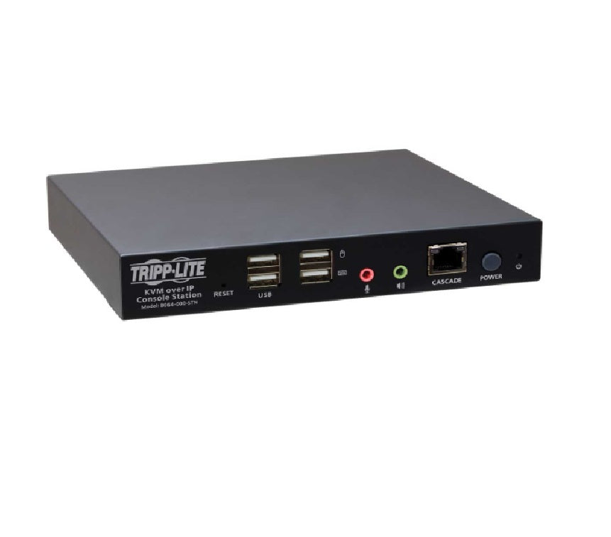 The Tripp Lite (by Eaton) B064-000-STN is an enterprise-level KVM-over-IP remote-user console station designed to provide secure, computer-free access to B064-IPG series KVM switches. Compact metal housing; can be used on a desktop with rubber feet or mounted to a wall or rack (0U configuration) using the included plate.