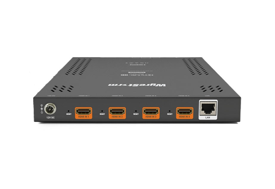 The WyreStorm NHD-140-TX is a quad-input H.264 encoder from the NetworkHD 100 series, designed to transmit up to four 1080p video streams simultaneously over a 1 Gigabit Ethernet network. It is a space-saving device, combining four transmitters into one unit, which can be rack-mounted for high-density installations